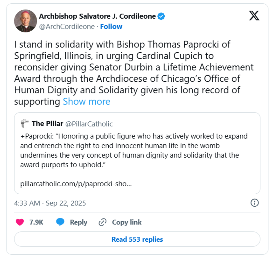 “I stand in solidarity with Bishop Thomas Paprocki of Springfield, Illinois, in urging Cardinal Cupich to reconsider giving Senator Durbin a Lifetime Achievement Award through the Archdiocese of Chicago’s Office of Human Dignity and Solidarity given his long record of supporting legal abortion,” Archbishop Cordileone wrote.